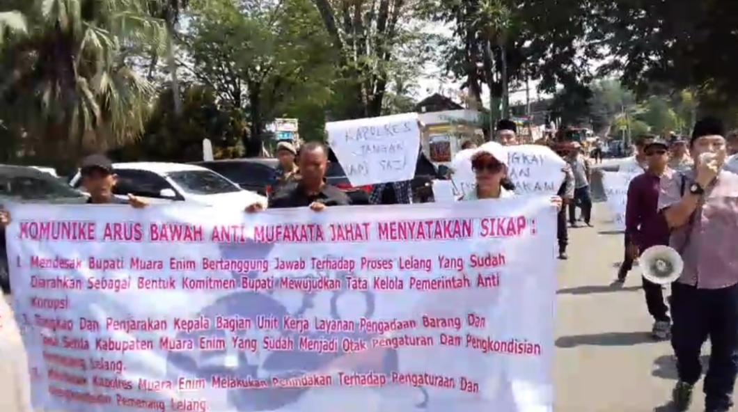 Koordinator aksi, H Ardiansyah dengan lantang mengatakan bahwa pada aksi unjuk rasa ini pihaknya telah membawa 10 contoh dari ratusan lelang terbuka yang dilaksanakan Unit Kerja Layanan Pengadaan Setda Muara Enim yang dinilai ada kejanggalan.